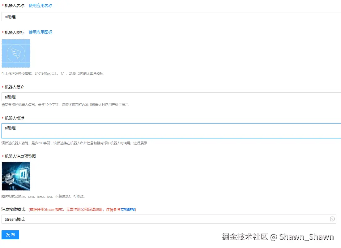 机器人名称,图标,简介,描述,消息预览图都是必填项,消息模式选择stream模式。