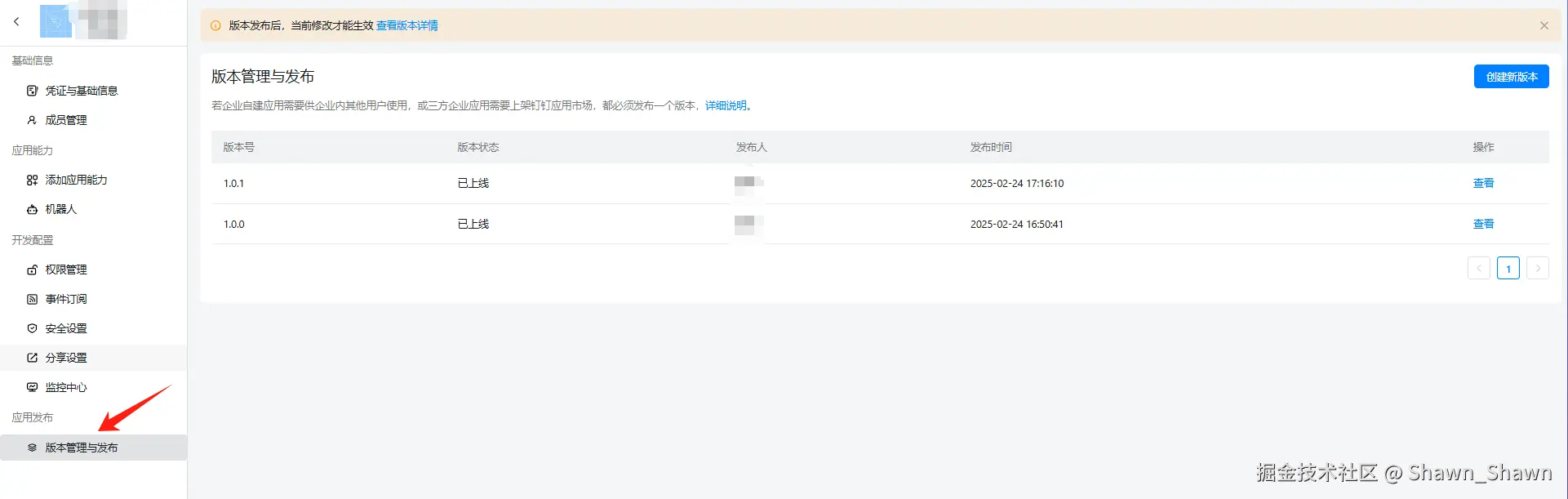 - 然后点击发布,再去到左边栏的应用发布 -> 版本管理与发布 -> 创建新版本,给应用建立一个新版本进行发布。