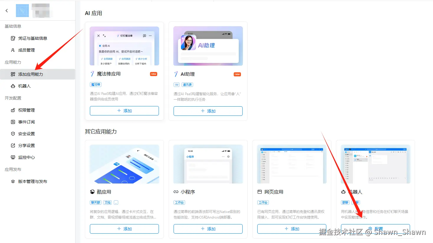 - 然后自动进入应用开发配置界面(后续需要修改,也可在应用列表页面点击需要修改的应用),通过 添加应用能力 添加机器人能力。