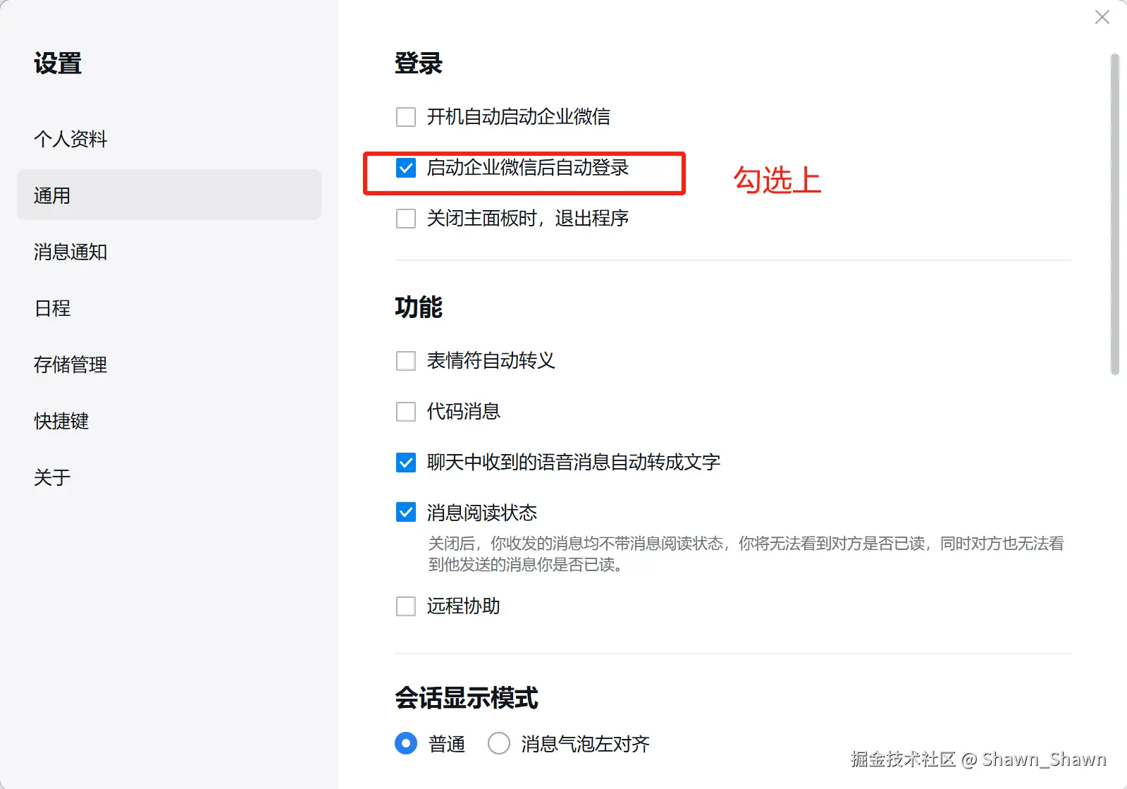 - 登录成功后,打开设置,勾选上启动企业微信后自动登录,去掉自动更新的选项。然后关闭最新版本的企业微信程序