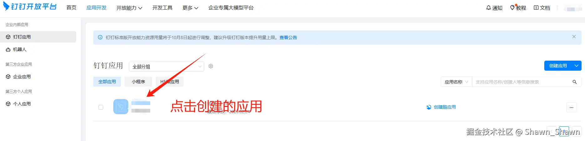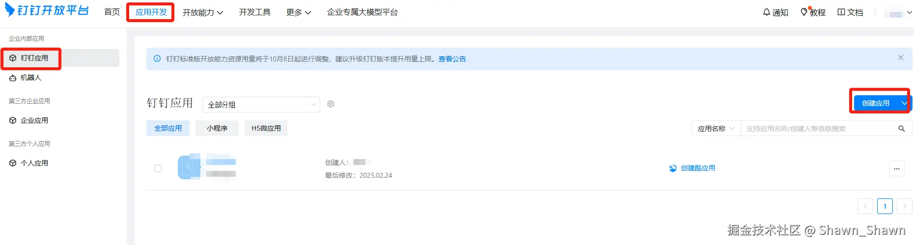 - 登录进入 开发者后台统一登录 - 钉钉统一身份认证,选择合适的组织,进入企业内部应用开发页面,创建一个企业内部应用。