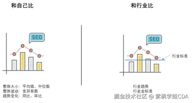对比的对象可以是自己,也可以是行业。如果是和自己比的话,可以通过某段时间的业务平均值、中位数等统计指标来衡量业务的整体大小;也可以通过变异系数来衡量业务整体的波动;同时也可以使用同比、环比等指标来衡量业务的变化趋势。如果是和行业比较的话,可以通过行业趋势与业务发展趋势进行对比,以判断业务发展是否健康;当然也可以和行业的金标准进行对比,以确定业务发展是否达到行业标准,进而调整业务发展方向和策略!