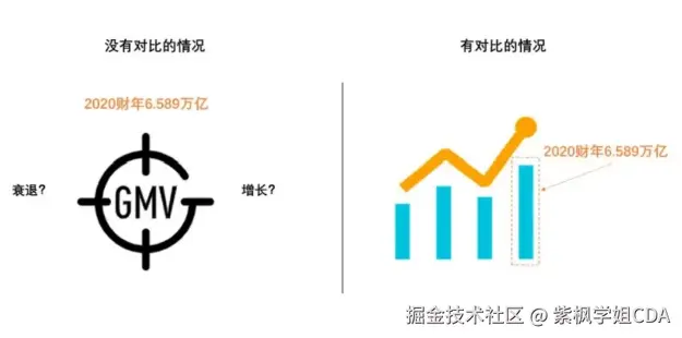 举个例子来说,2020财年淘宝天猫GMV达成6.589万亿,如果没有对比GMV只是一个数字而已,我们并不知道这个数字代表的业务状况到底如何,业务是增长了呢,还是衰退了呢?如果我们把前三财年的GMV数据也放上,就会发现2020财年的GMV是增长的,从这个对比数据来看业务是稳定上升的。这就是对比分析在数据分析中的作用,没有对比就没有数据结论!