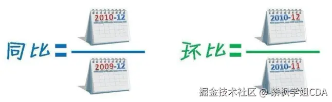 时间维度:拿昨天跟前天比,拿这个星期跟上个星期比(环比、同比)等等。简单说一下同比的环比的区别,如图片。