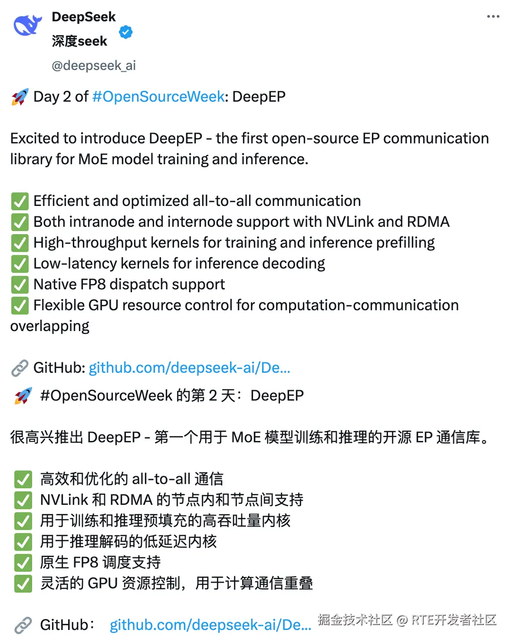 「很高兴向大家介绍 DeepEP——首个专为 MoE(专家混合)模型训练和推理打造的开源 EP 通信库。