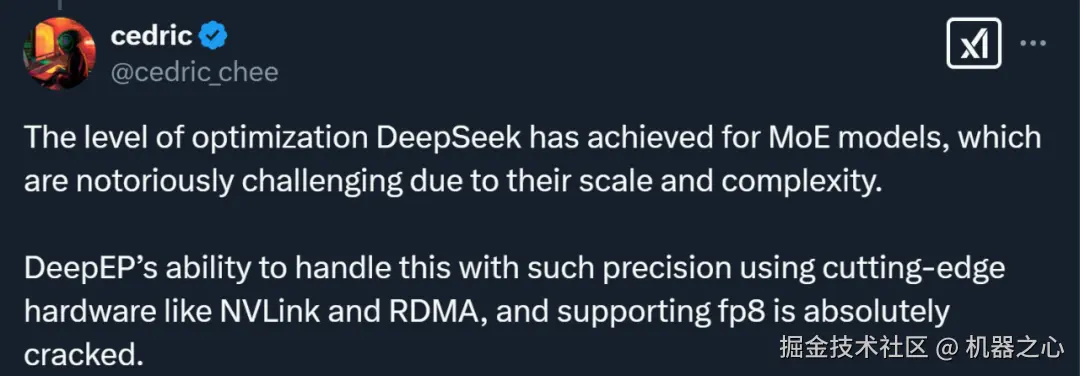 该项目开源后,有人评价说:DeepSeek 为 MoE 模型所达到的优化水平令人印象深刻,这类模型因其规模和复杂性而充满挑战性。DeepEP 能够利用 NVLink 和 RDMA 等尖端硬件技术,并支持 fp8 精度,以如此精确的方式处理这些挑战,简直是突破性的成就。
