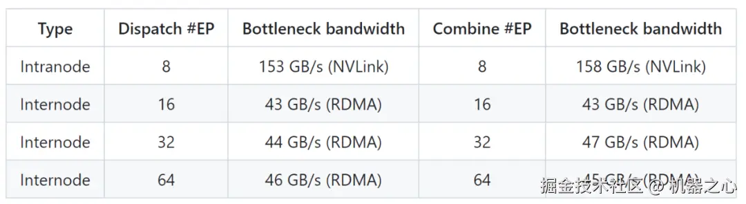 DeepSeek 在 H800 上测试常规内核(NVLink 最大带宽约 160 GB/s),每个 H800 连接到一个 CX7 InfiniBand 400 Gb/s RDMA 网卡(最大带宽约 50 GB/s)。他们遵循 DeepSeek-V3/R1 预训练设置(每批次 4096 个 token,7168 隐藏维度,top-4 组,top-8 专家,FP8 分发和 BF16 合并)。