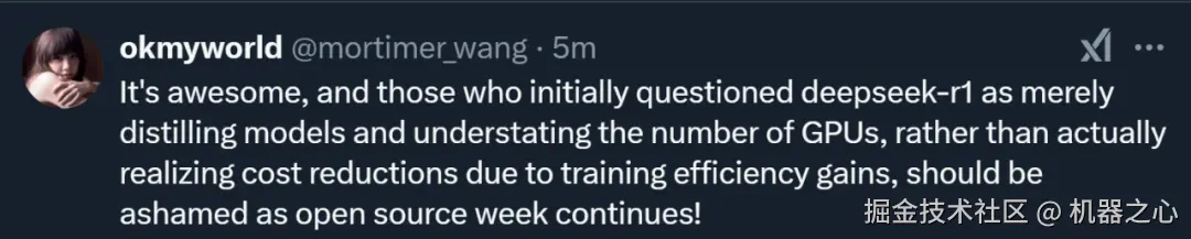 之前,有人曾质疑 DeepSeek-R1 只是通过模型蒸馏来实现其性能,而非真正的技术创新。还有人怀疑 DeepSeek 低报了训练所需的 GPU 数量。开源周发布的这些内容可以从某些角度证明,DeepSeek 确实通过技术创新实现了真正的训练效率提升和成本降低。