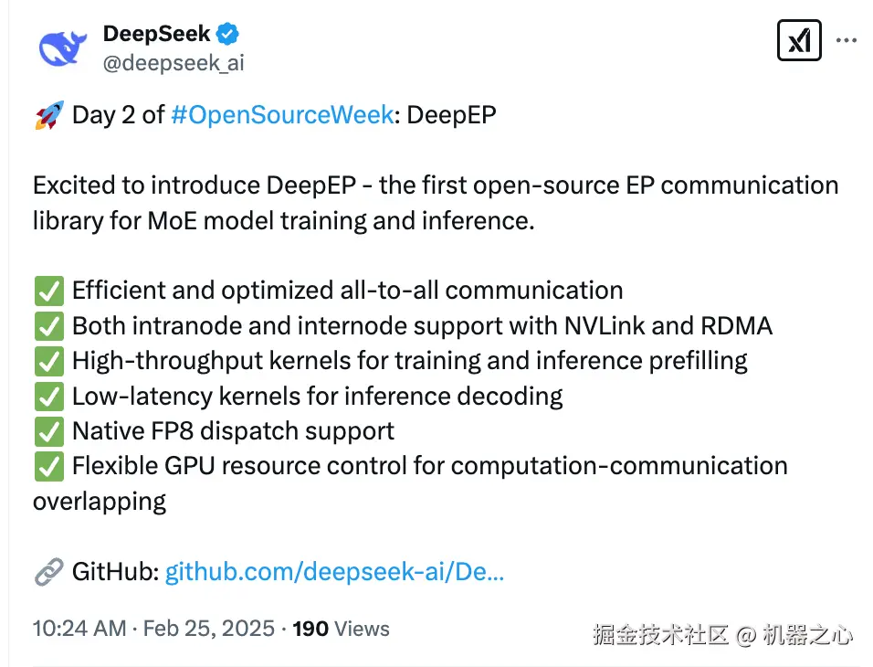 MLA 和 MoE 架构改进可以说是 DeepSeek 的两大重要创新点。昨天是对 MLA 解码内核的优化,今天就公开了另一张王牌 MoE 如何高效通信和并行处理,DeepSeek 可真是太 Open 了!