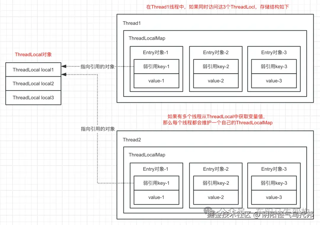 假设在业务代码中使用完ThreadLocal ,栈中的ThreadLocalRef被回收了。但是因为ThreadLocalMap对象的Entry元素强引用了ThreadLocal对象,那么就可能会造成ThreadLocal对象无法被回收。