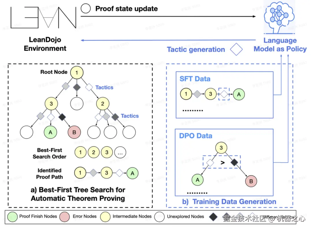 整个系统形成闭环:LLM 生成策略 → LeanDojo 执行 → 获取反馈 → 生成训练数据→优化 LLM → 再次生成策略,实现了持续改进的专家迭代机制。