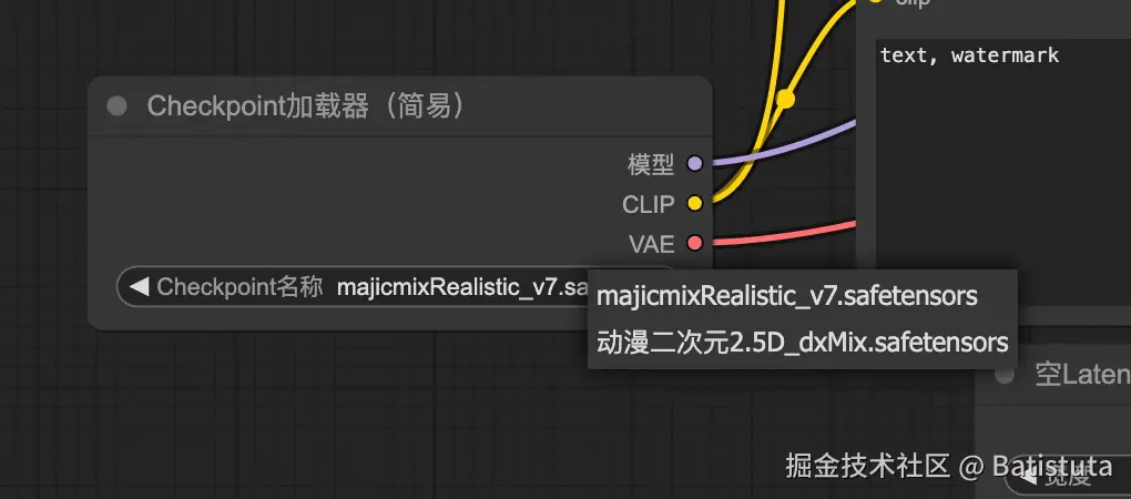 - Checkpoint加载器:作为工作流起点,用于加载Stable Diffusion大模型(如SD 1.5/SDXL),自动解析模型的VAE和CLIP组件,支持自定义VAE模型加载