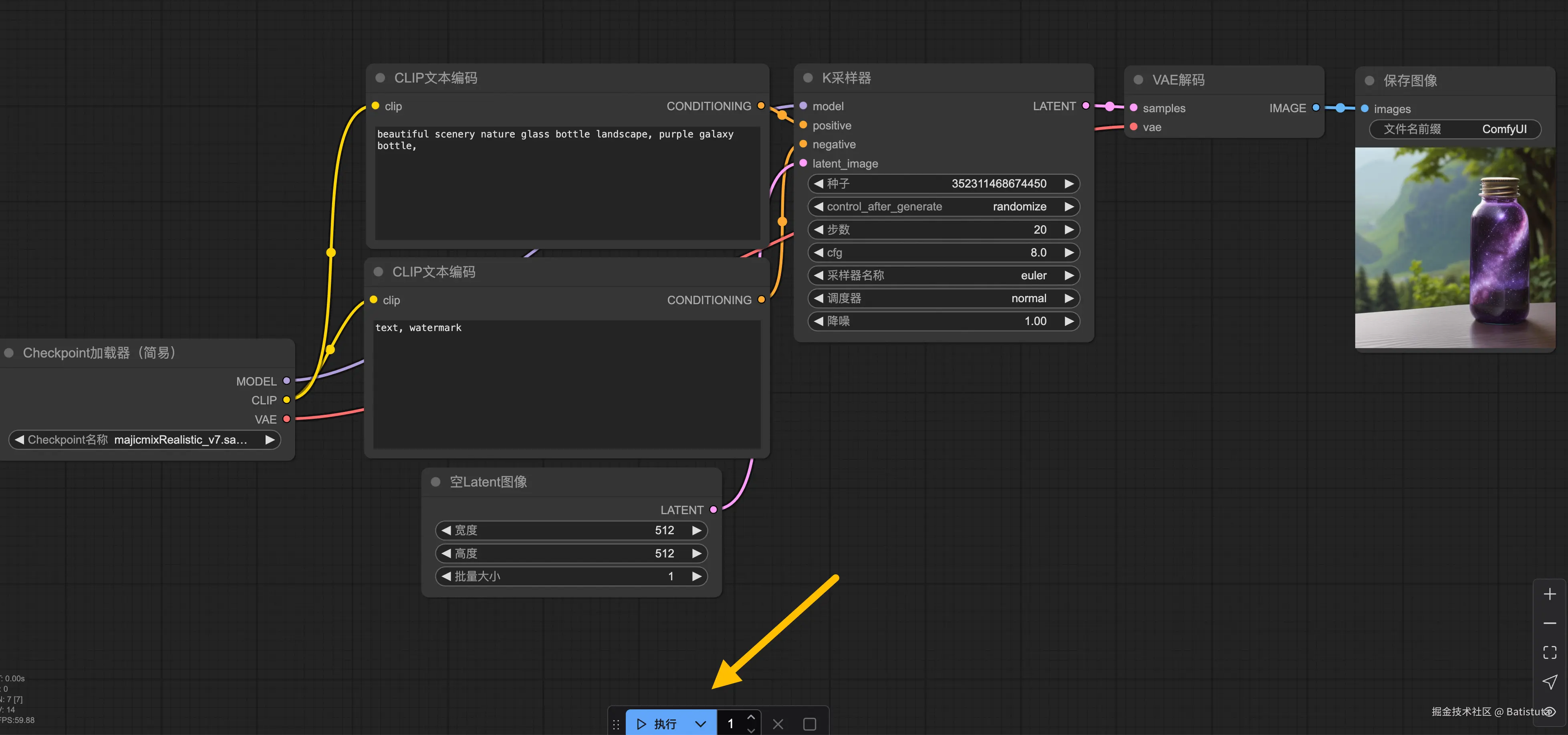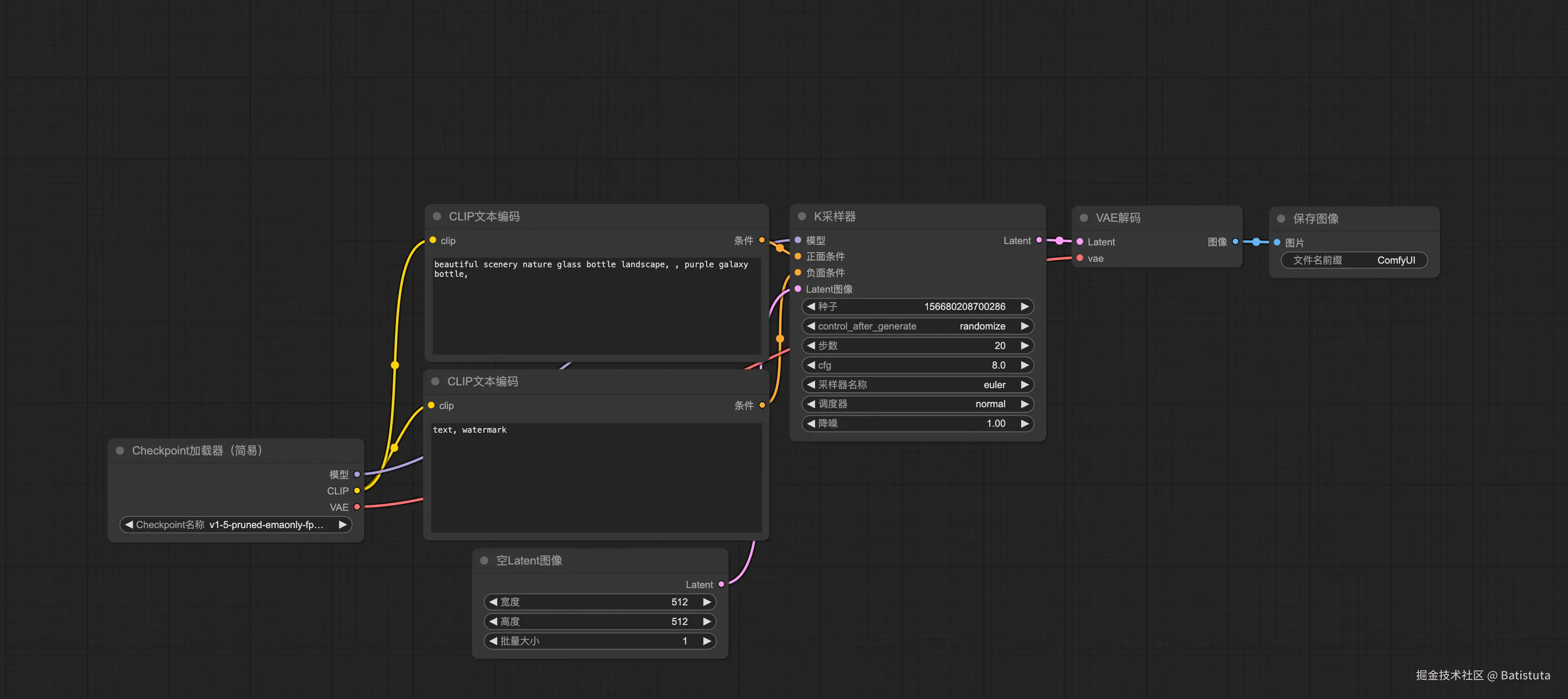 下图就是一个经典的玻璃瓶图片生成工作流,提示词“beautiful scenery nature glass bottle landscape, purple galaxy bottle,”