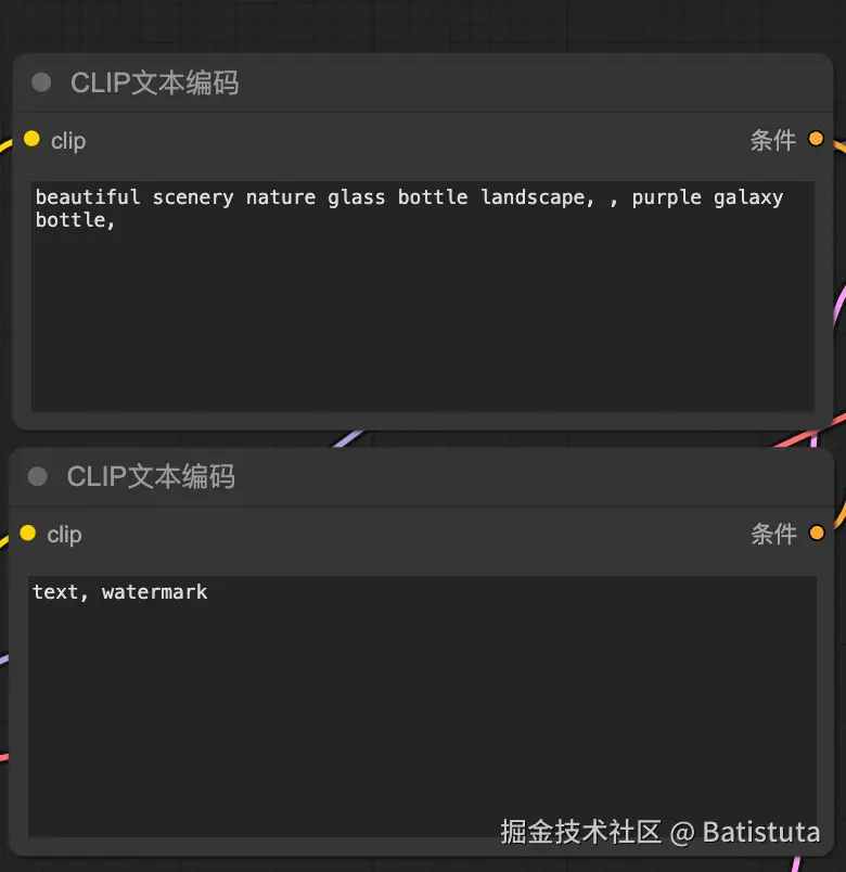 - CLIP文本编码器:包含正向/负向提示词输入节点,分别连接K采样器的正负条件输入,实现文本条件控制