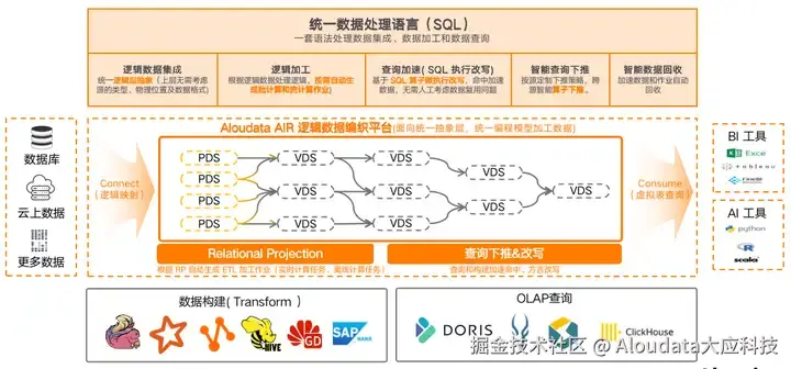 异构数据编织:通过统一的 SQL 查询能力实现对异构数据源的整合,类似于 Presto、Trino、Spark 等跨源查询引擎。数据虚拟化引擎在连接层统一集成各类数据源,并通过标准化的 SQL 接口提供跨源查询和数据处理功能,使用户能够高效访问和操作多种数据类型而无需关注底层存储细节。