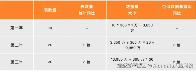假设每年物理表的数量增长 1 倍,物理表的数量和存储数据量的增长关系可以通过如下表格体现: