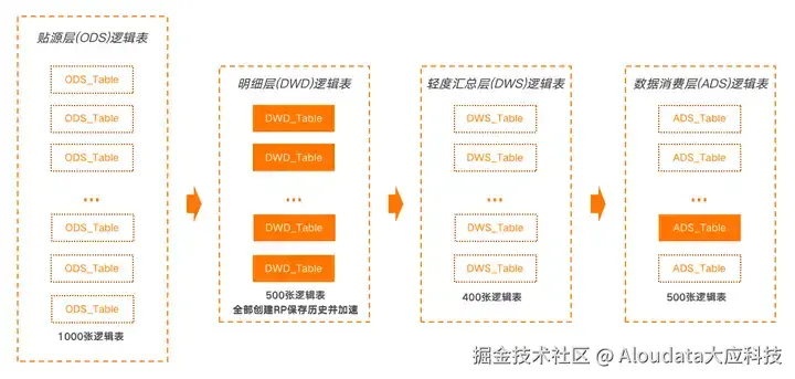 - 通过逻辑化后的按需物化可以节省哪些成本? 那么,同样的分层资产建设,假设 ODS 层有 1,000 张表,DWD 层 500 张表,DWS 层 400 张表,应用层 500 张表(我们以客户刚建设数仓第一年的状态来假设数据,实际的情况是,随着数仓使用时间的增加,一般应用层的表数量往往会极度膨胀),那么传统数仓中我们需要建设:1,000 + 500 + 400 + 500 = 2,400 张物理表及其对应的调度任务。如下图: