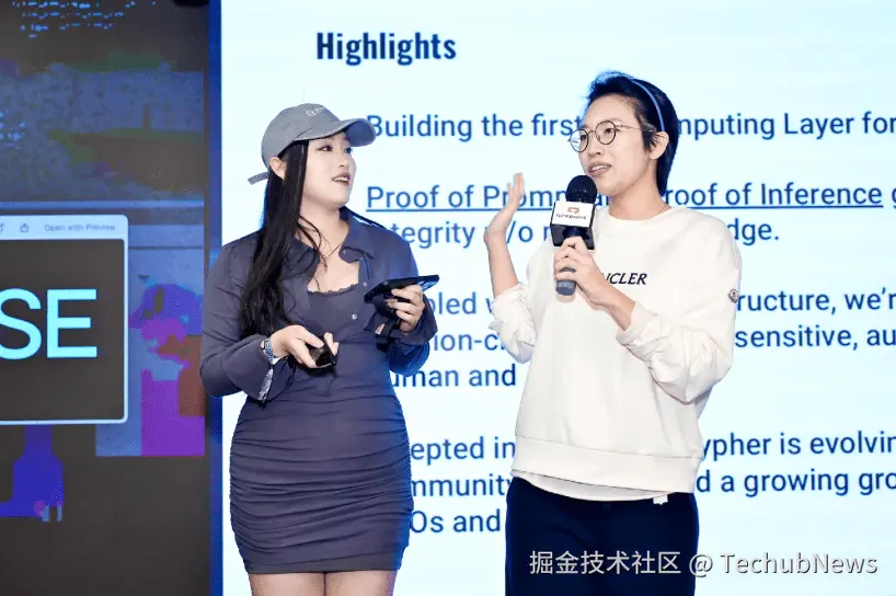 Zypher Network 代表也带来了令人瞩目的演讲。他首先介绍了团队中的核心成员 Amber,并称赞其为连接外界的桥梁,再阐述了 Zypher Network 如何通过零知识计算(ZK)层赋能无需信任的 AI 代理与去中心化应用(DApp)。Zypher Network 定位为区块链首个无需信任 AI 代理平台,利用自研 ZK 计算层(如 Proof of Prompt 和 Proof of Inference 技术)保障 AI 代理行为的透明性与数据隐私。其核心技术在不泄露敏感信息的前提下,验证 AI 提示的完整性与推理逻辑的正确性,为金融分析、自动化 DeFi、游戏等场景提供安全基础。平台已集成主流 AI 模型并支持多链生态,应用场景丰富多样,包括基于 Proof of Prompt 的 AI 代理 Alpha Girl 实现 BTC 价格预测、链上扑克游戏 Poking King 利用 ZK 推理验证确保游戏公平性,以及为 DeFi 场景提供透明风控与自动化策略执行的解决方案。生态进展方面,Zypher 已构建庞大社区并集成多家合作伙伴,计划推出 ZK 协处理器、主网及第三方验证网络,并扩展至链上游戏引擎等服务。