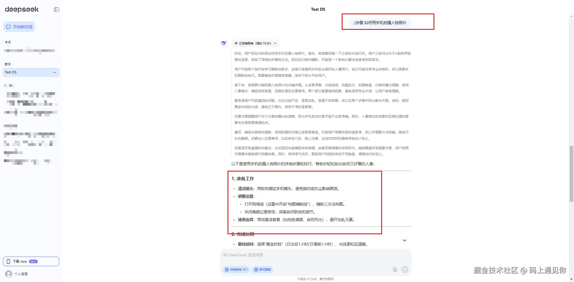 - 输入:“/步骤 如何用手机拍摄人物照片”,观察分步指导。