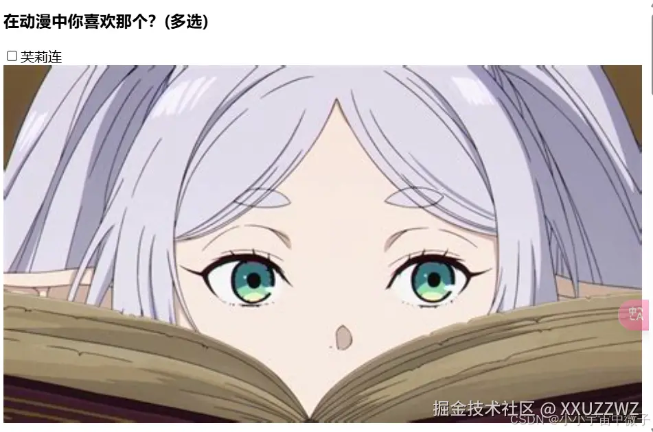 <label><input type = "checkbox">芙莉连<img src =https://tse1-mm.cn.bing.net/th/id/OIP-C.ODe9iSJfofzGqtVeYxV-7AHaEK ></label><p></p>