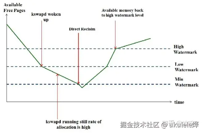 (1)内存可用量小于low水位,kswapd开始介入进行异步内存回收(非阻塞式)