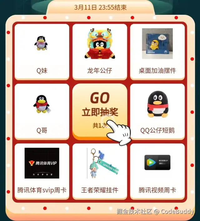 腾讯云 AI 代码助手官方将从上传截图的用户中每日再评选 3位 优质反馈用户(综合内容质量、转评赞数量评选),加赠腾讯定制周边露营桌(价值 300 元) ,并于每个工作日晚上 6 点在【公众号文章评论区+社群】公布中奖用户昵称