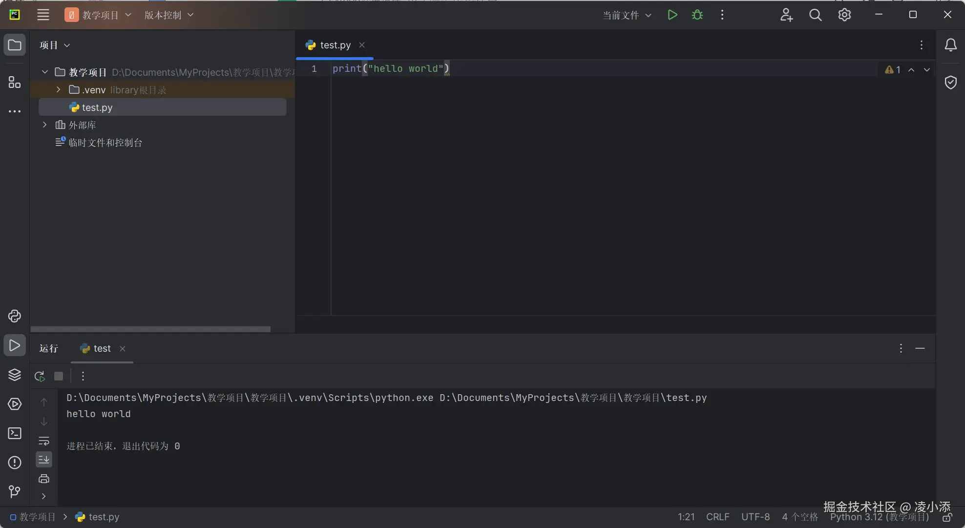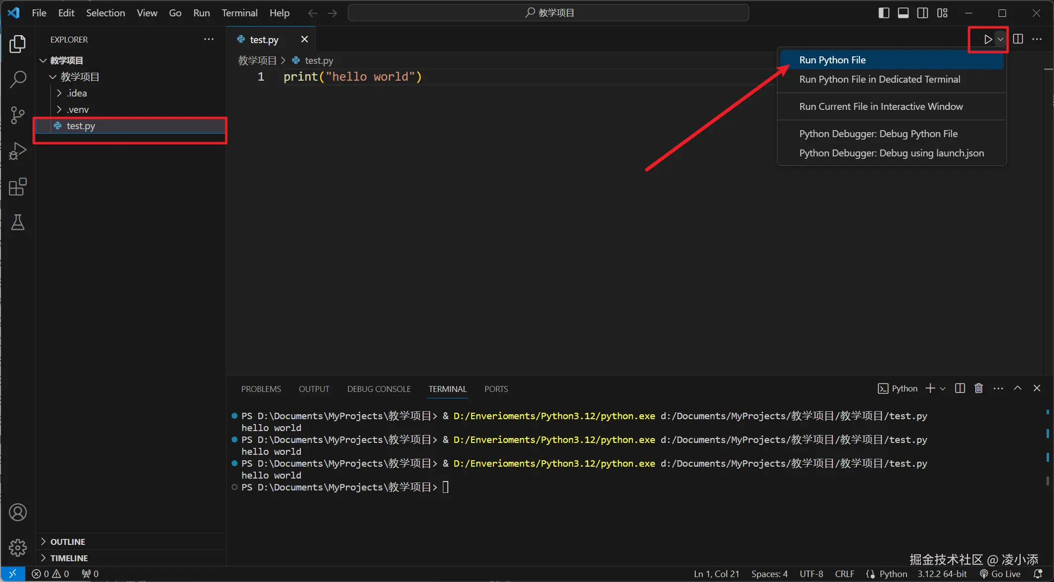 创建一个.py文件,点击右上角的运行按钮就可以运行代码了!