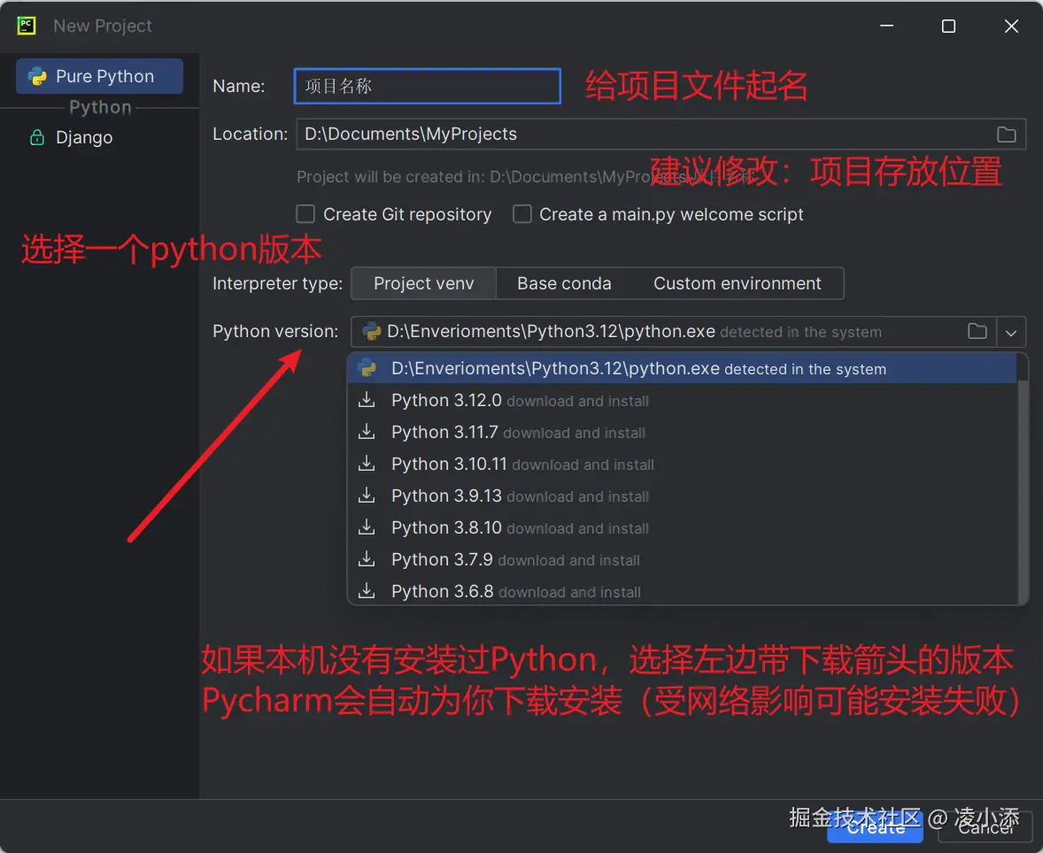 如果你并没有自己下载安装python,别着急,在下面选择一个版本,Pycharm会自动为你安装。