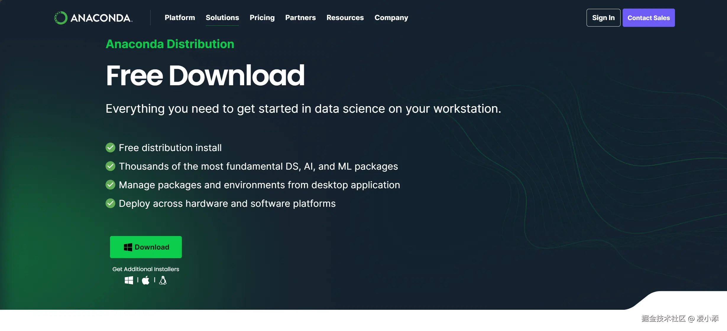 Anaconda是一款包含Python在内的开源数据科学平台,集成了 Python 解释器、Conda 包管理器、以及超过 140 个用于科学计算、数据分析、机器学习等领域的预编译软件包。同时自带Jupyter Notebook和Spyder IDE。