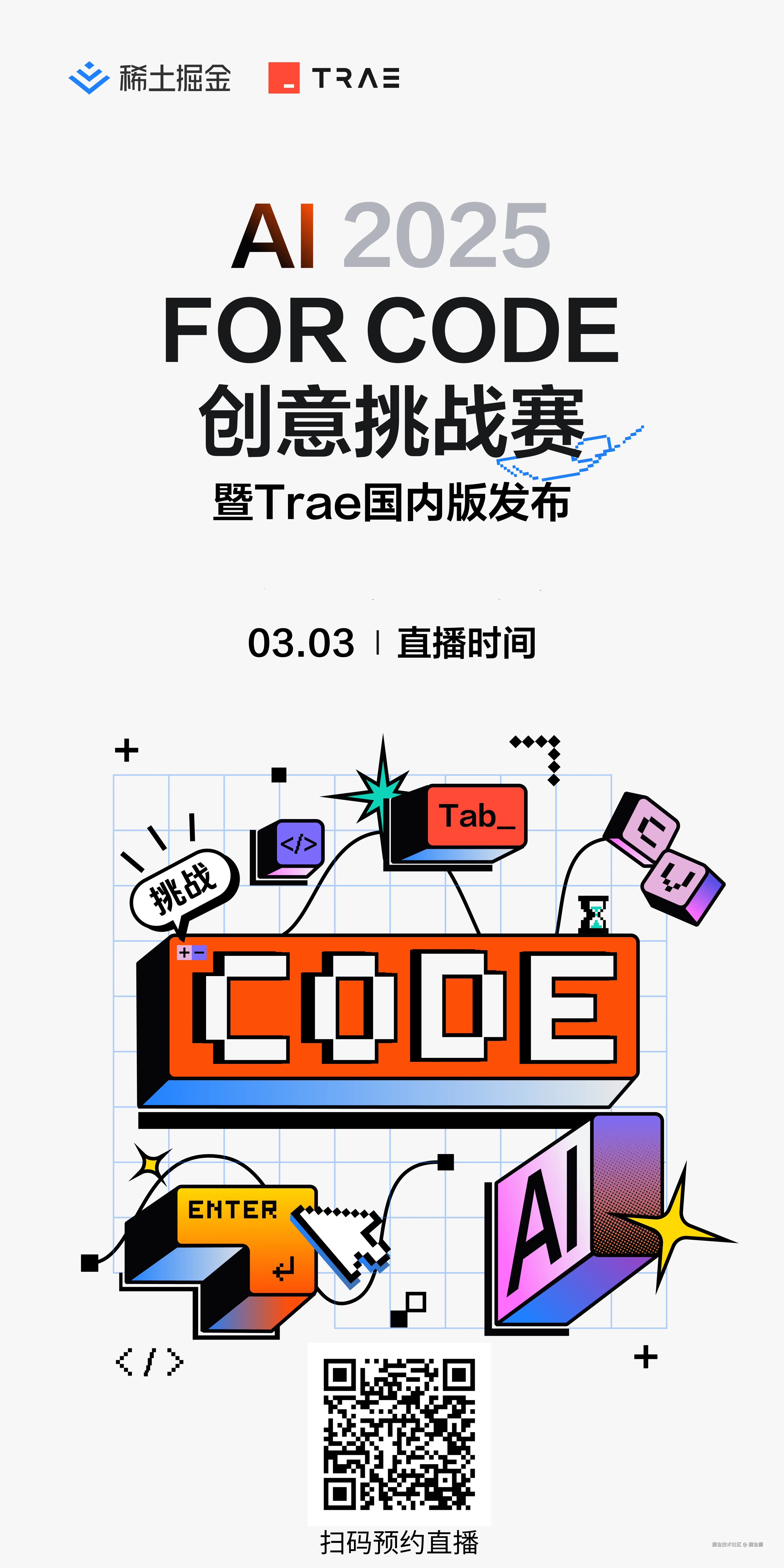 3月3日18:00,AI FOR CODE创意挑战赛启动仪式会为您详细介绍活动内容及Trae 新场景的探索,稀土掘金官网直播间期待您的参加!
