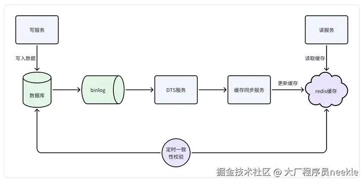 这种方式加入了一致性校验链路,可以作为DTS的兜底、监控,解决了DTS故障造成的数据不一致问题。