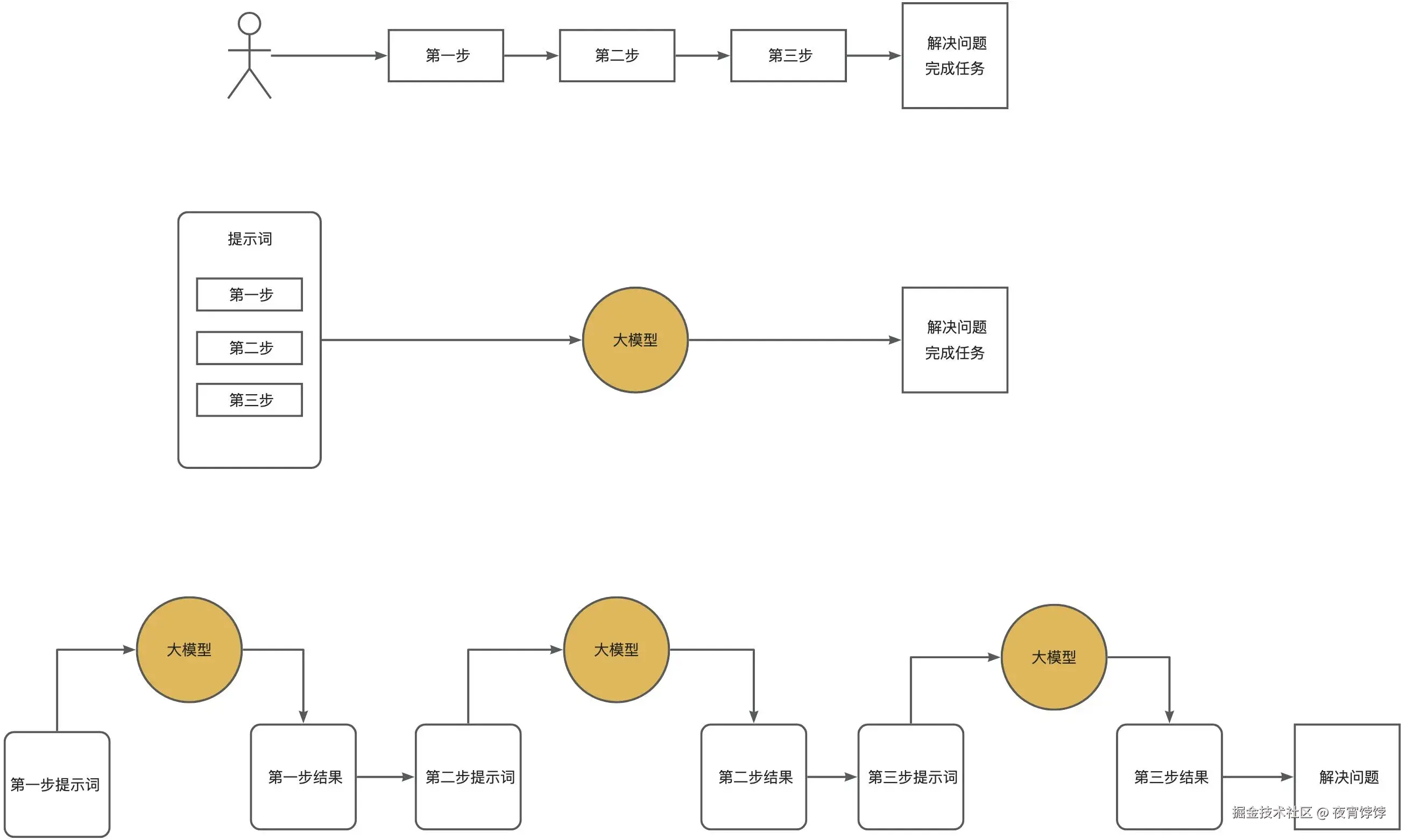 🌟 这里有一个很重要的区别地方:在上述中的概念,工作流的概念,这里会分出一个支路,提示词的工作流和模型调用的工作流,这是两种不同的方式,但是目的都是让大模型专注解决问题