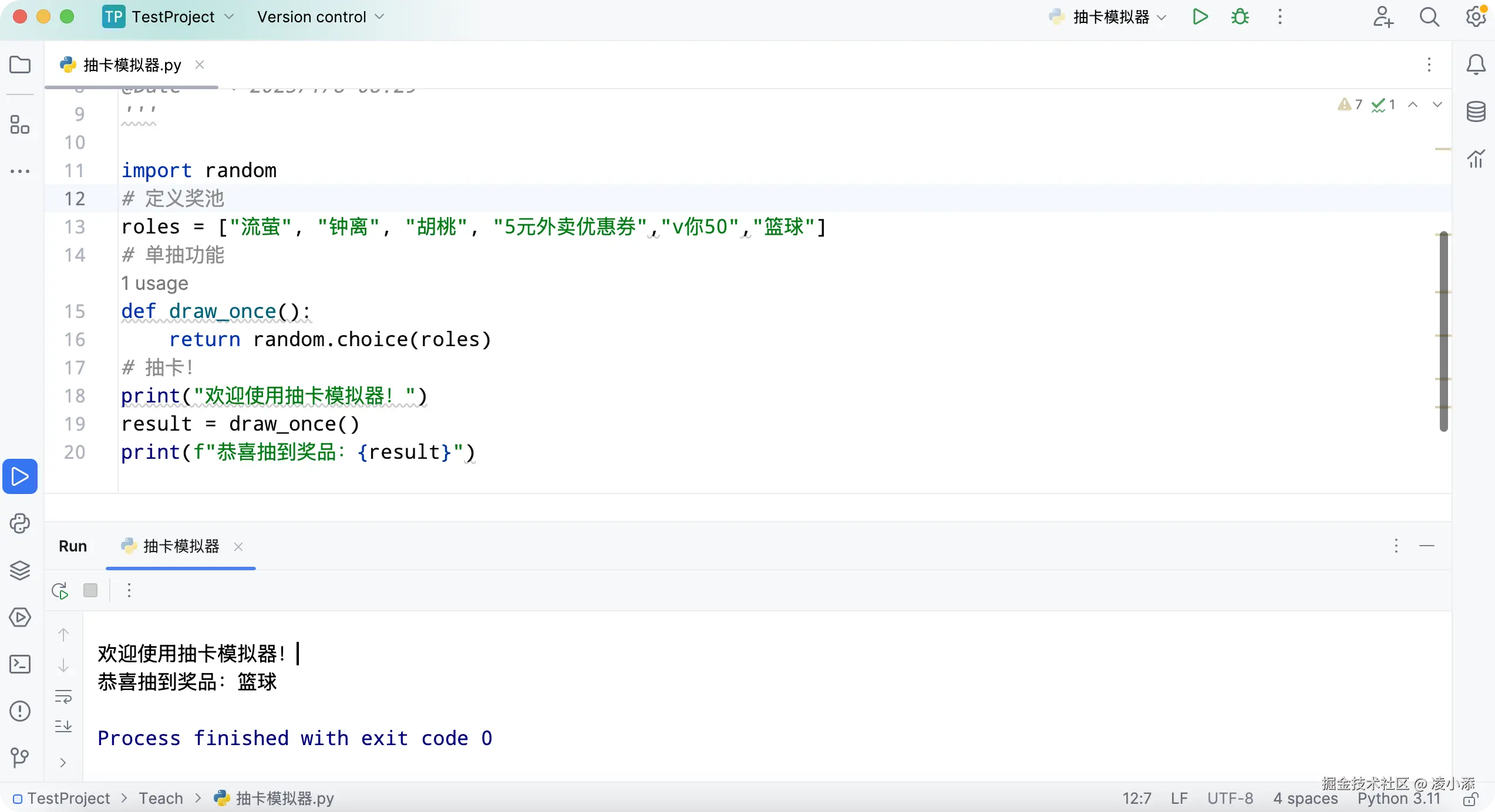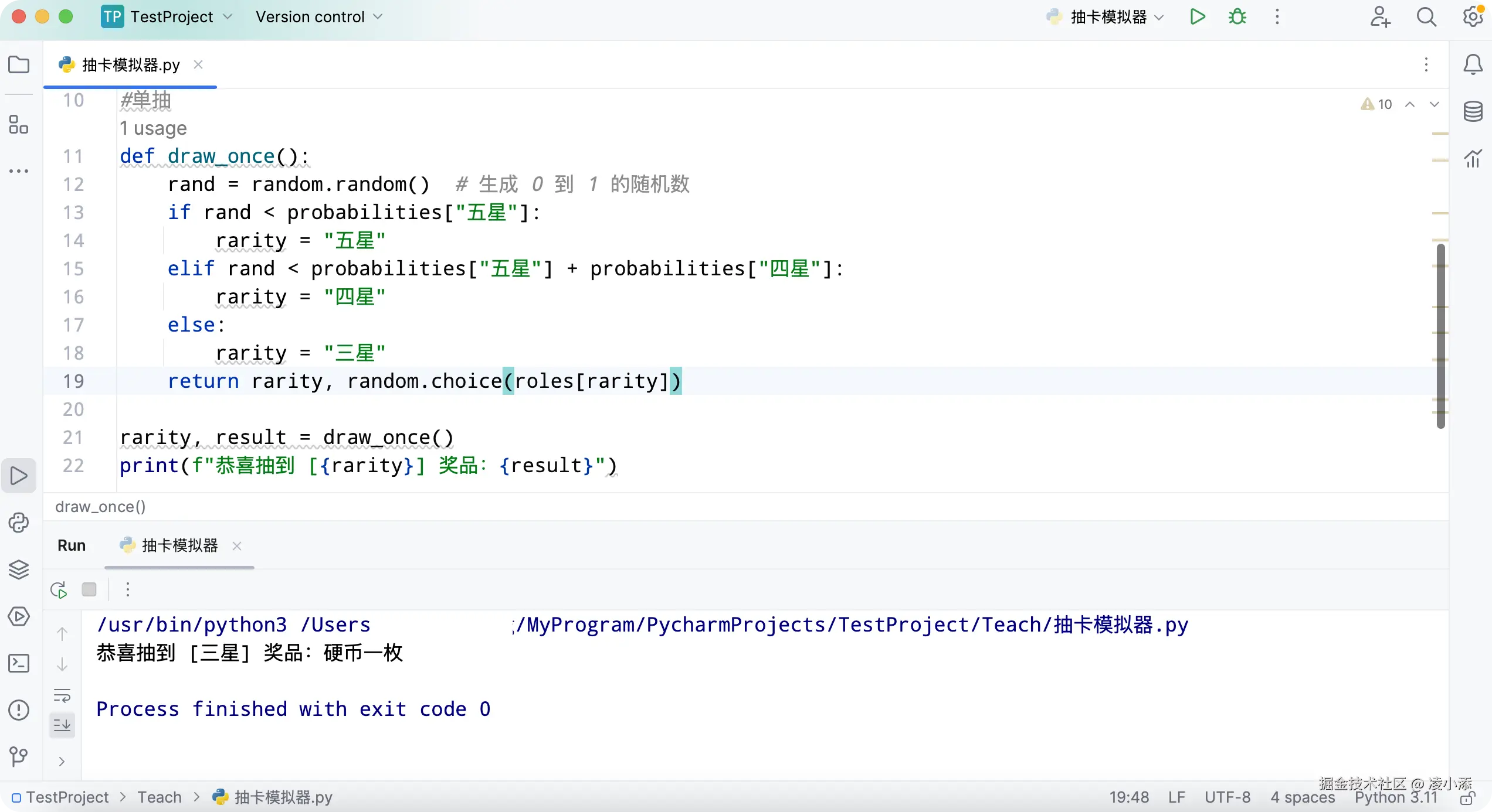 在上一个例子中,我们将单次抽卡的操作定义为了一个函数draw_once()。