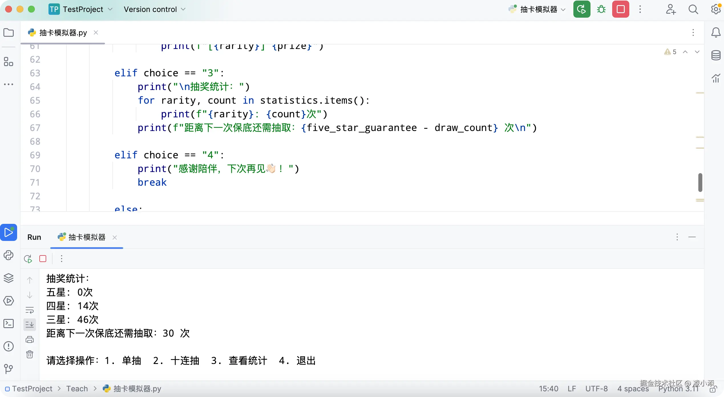 choice = input("请选择操作:1. 单抽 2. 十连抽 3. 查看统计 4. 退出\n")