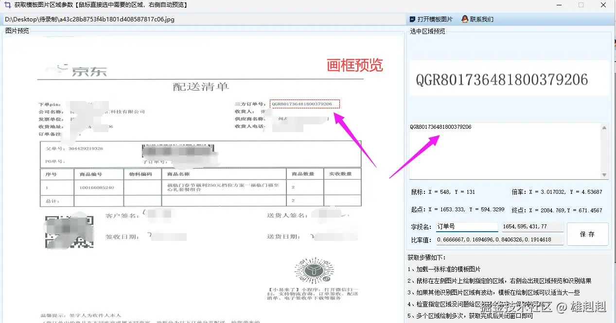 框选区域:将图片拖入软件界面,用鼠标框选需要识别的区域,并在右侧进行预览。