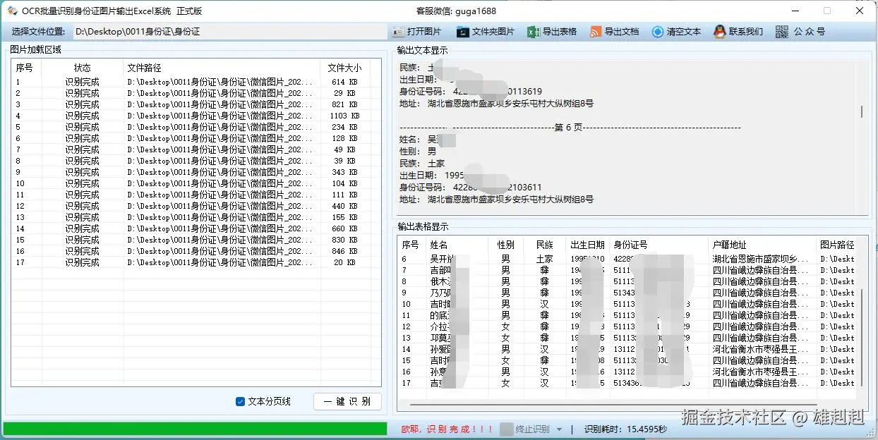 以前我们出过一款批量图片文字识别的软件,很多童鞋提出来了一些证件的OCR然后需要表格的形式工作之余呢,进行了一些身份证证件的识别优化处理,可以对大批量身份证的图片或扫描件进行识别,然后输出成表格的形式
