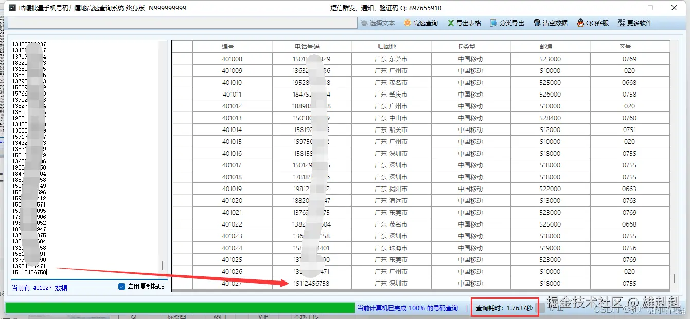 点击“高速查询”按钮,软件将以每秒1000个号码的速度进行查询。
