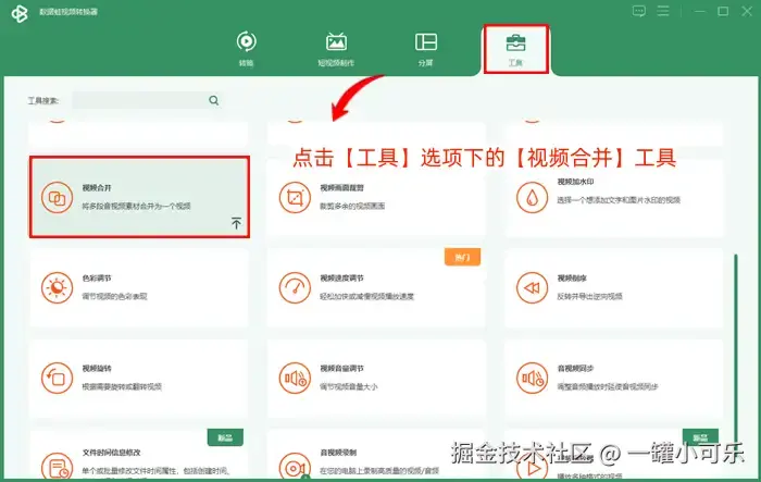 ① 运行应用:双击电脑桌面端的数据 蛙视频转换器,点击【工具】选项下的【视频合并】工具。