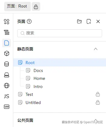 接着再添加一个子页面名为 Docs,你可以参考刚刚添加 Intro 页面的步骤添加 Docs 页面,也可以直接在 Root 页面下新建子页面。最终 Root 页面的树结构为这样