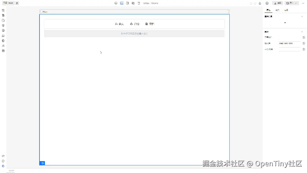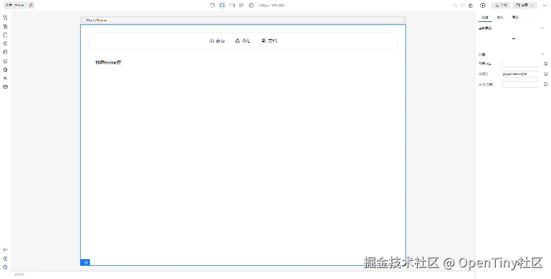 新增了内置物料,属性配置中新增页面选择器。打开 Root 页面,我们从物料拖入导航条和路由视图。导航条是预设的多个路由链接组成的 snippet,路由链接设置好跳转页面后可以用来跳转到其他路由,路由视图则是子路由插槽。这里的逻辑和 vue-router 是保持一致的,并且最终出码也是使用的 vue-router。在这里我们给每个路由链接设置到对应的路由