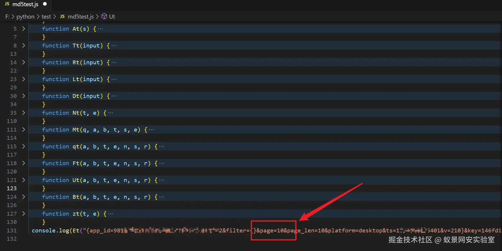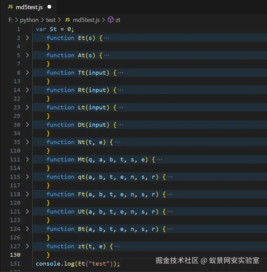 通过算法分析可以看出主要调用Et()方法后进行一系列的函数调用,最后返回了需要的sign值,那么这时我们将该js中调用执行过的方法进行复制,在本地新建一个js,粘贴其中,最终打印Et()方法,Et中传入需要的值,也就是n,然后进行运行,如果存在报错缺少方法,缺哪个便去js中复制那个。