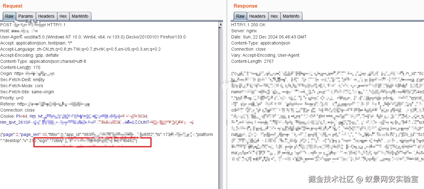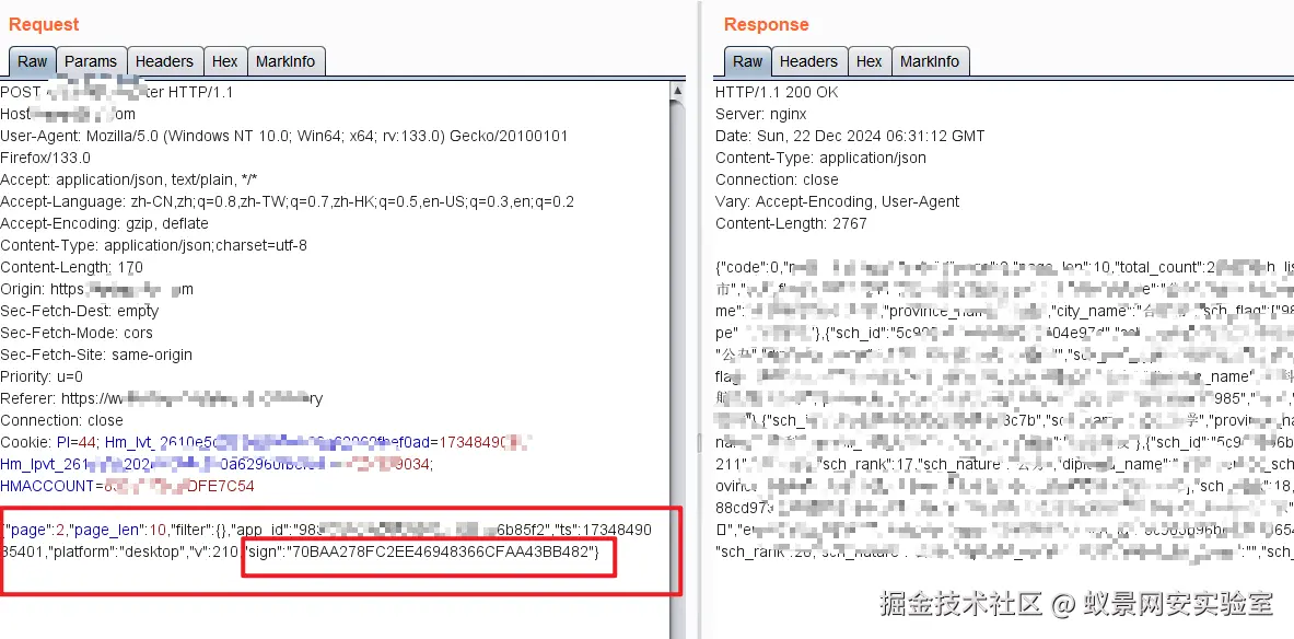通过抓包可以看到该请求体中存在sign参数,值为一段数字字母