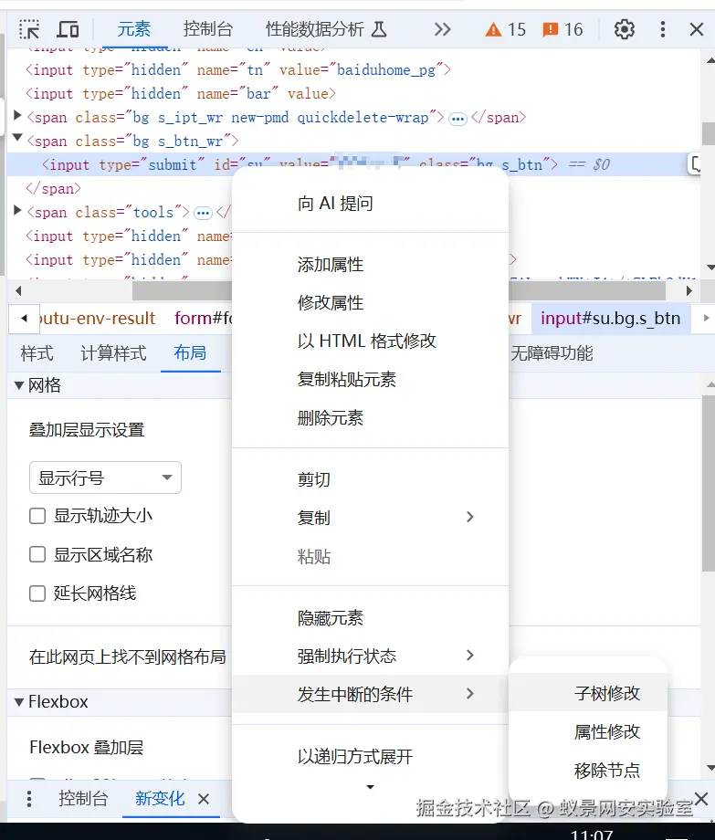 在Chrome开发者工具的Elements标签页中,找到你想要设置断点的DOM元素,右键点击该元素,选择"Break on"选项,然后根据需要选择以下三种断点之一:
