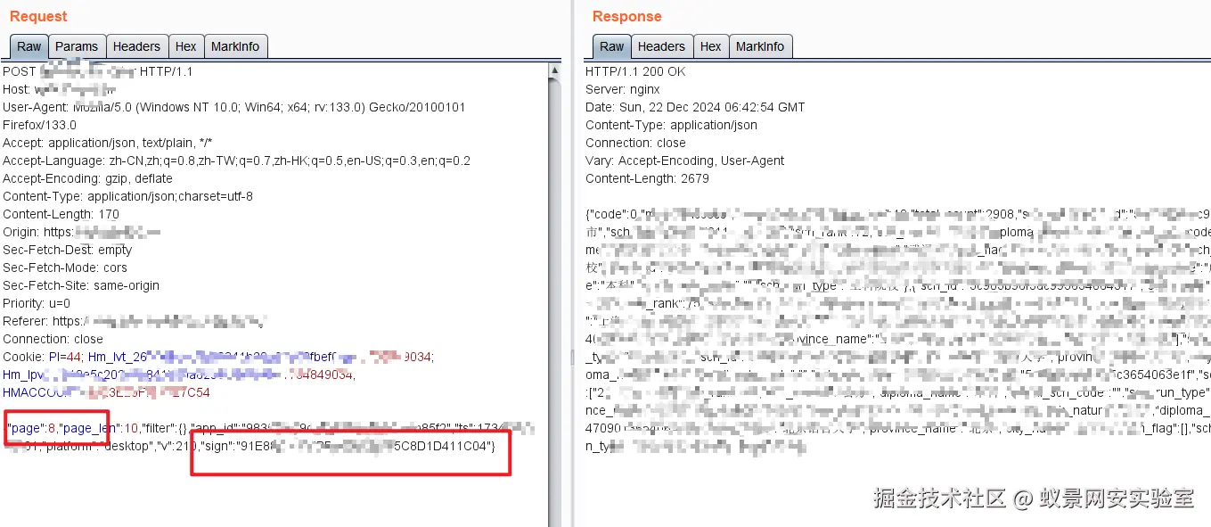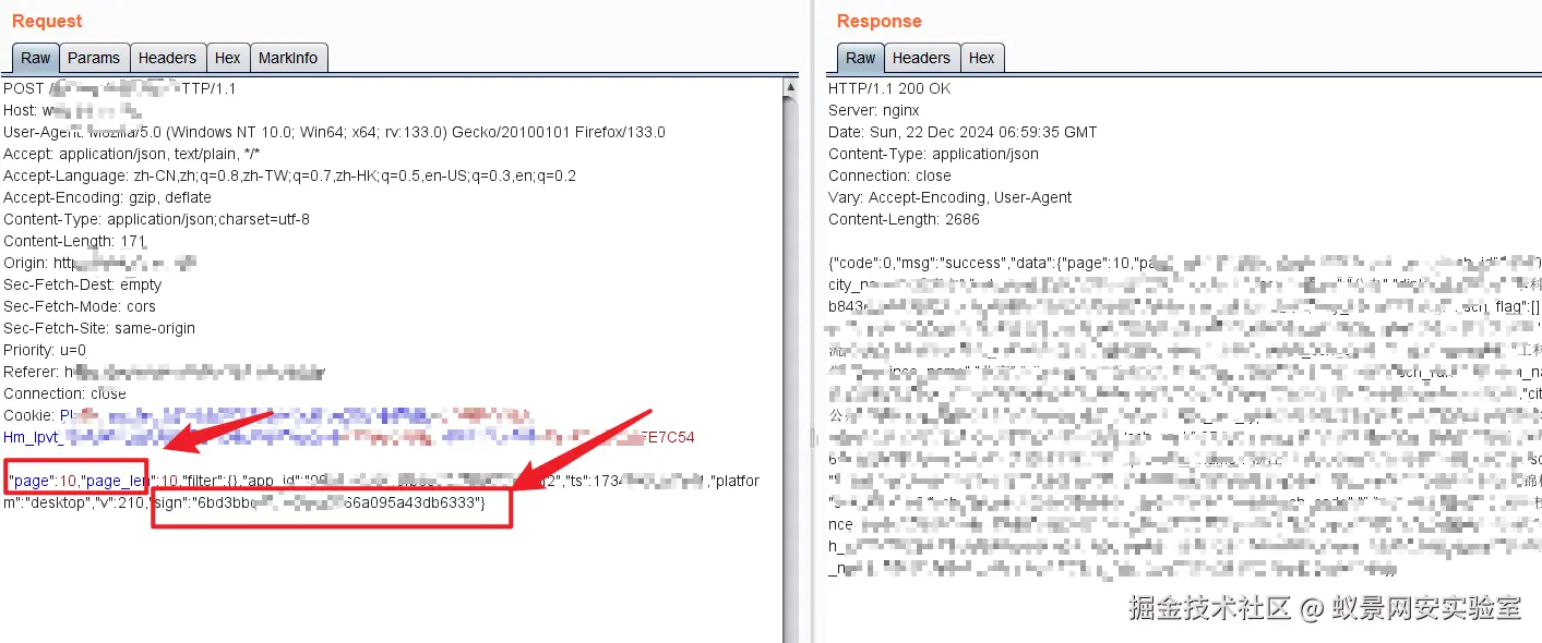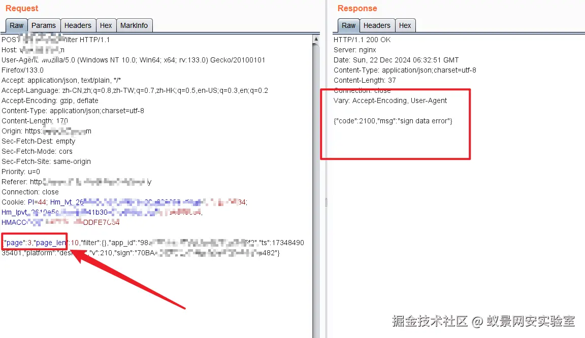 修改page内容,重新进行提交请求,返回错误,那么这时候想要测试注入等手法都是无法成功的,因为当重放是sign值是未变的,所以后端验证也是不通过的。接下来首先就需要找出sign的算法逻辑,尝试绕过后才可以进行测试。