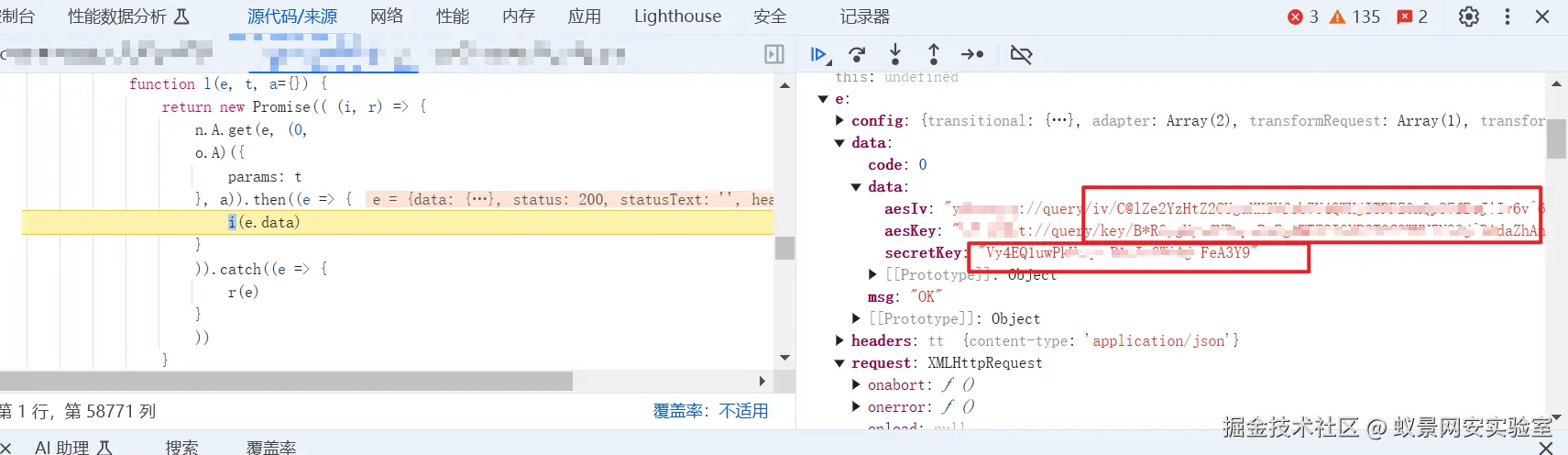 再跳过执行可以看到执行该函数da.A.decodeData(),从名称也可以看出为一个解码的函数,分别传入了o和key以及iv,那么o为加密的值,key和iv分别为前面获取到的内容,执行完成后成功返回了解密后的明文数据