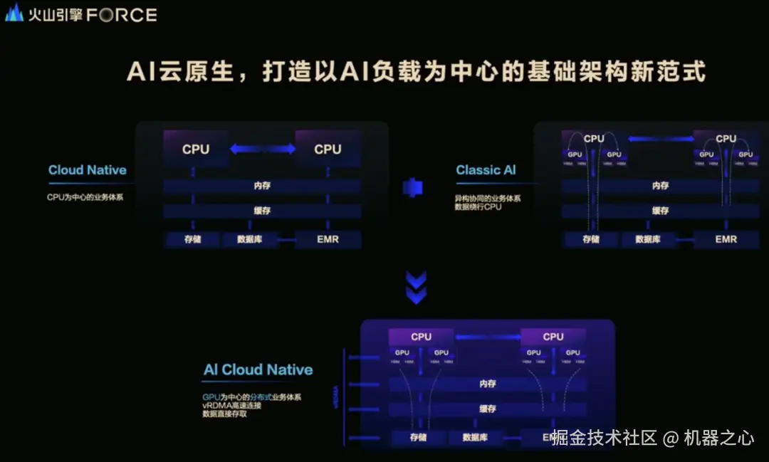 基于这一发展背景,「AI 云原生」则是将云原生理念应用到人工智能(AI)领域,专注于 AI 工作负载的云端构建和部署。2024 年 12 月,火山引擎成为了国内首个提出并实践「AI 云原生」的厂商。当时,火山引擎总裁谭待在 2024 冬季火山引擎 FORCE 原动力大会上表示:「我们认为下一个十年非常重要的事是计算范式从云原生进入到 AI 云原生的新时代。」他还指出,火山引擎指出 AI 云原生的特点是「以 GPU 为核心」。