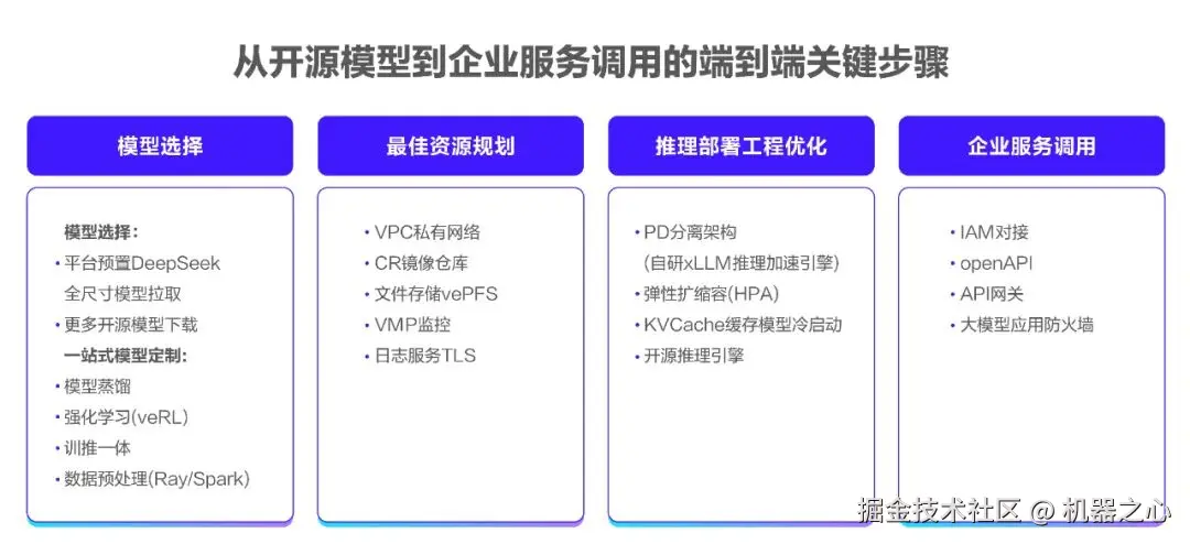 秉承 AI 云原生理念,火山引擎基于支持火山方舟和各行业客户 DeepSeek 实践的部署流程,总结出了从开源模型到企业部署调用的端到端关键步骤。