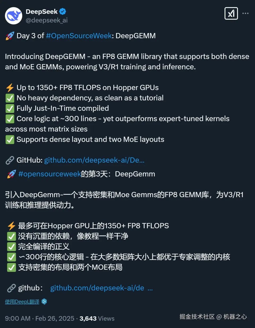 具体来说,DeepGEMM 是一个旨在实现简洁高效的 FP8 通用矩阵乘法(GEMM)的库,它采用了 DeepSeek-V3 中提出的细粒度 scaling 技术。该库支持普通 GEMM 以及专家混合(MoE)分组 GEMM。该库采用 CUDA 编写,在安装过程中无需编译,而是通过一个轻量级的 Just-In-Time(JIT)模块在运行时编译所有内核。