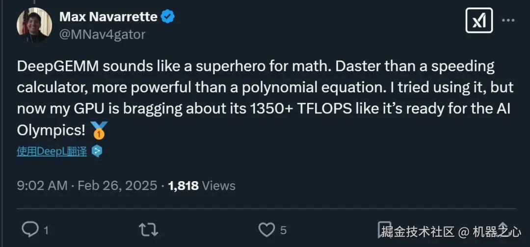 早期试用者评价说,「DeepGEMM 听起来就像是数学界的超级英雄。它比高速计算器还快,比多项式方程还强大。我试着用了一下,现在我的 GPU 都在炫耀它的 1350+ TFLOPS,仿佛已经准备好参加 AI 奥赛了!」
