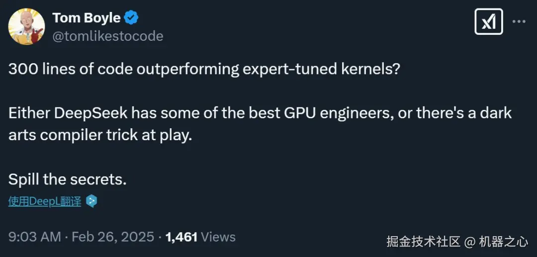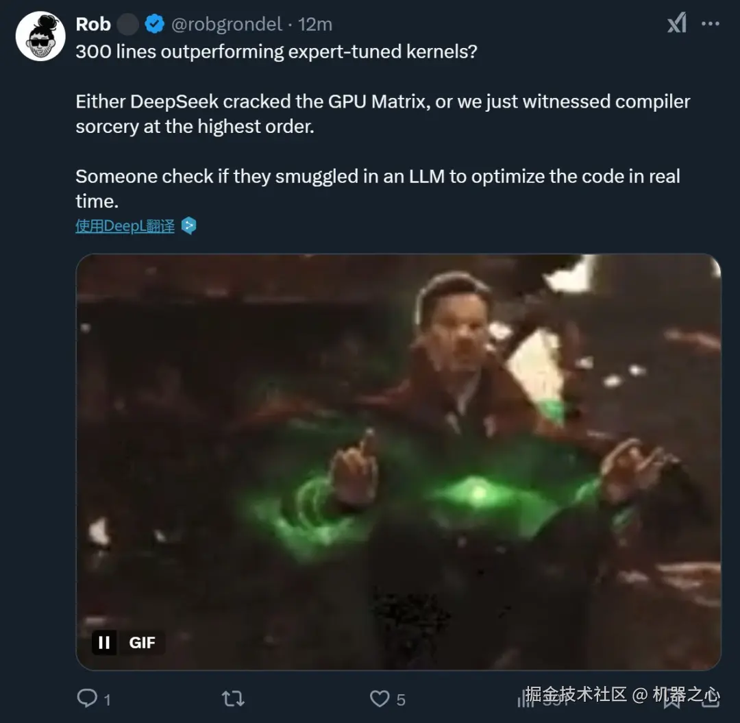 除了性能,「300 行代码的性能超越了专家调优的内核」同样让不少人感到惊讶,有人认为「要么 DeepSeek 破解了 GPU 矩阵的奥秘,要么我们刚刚见证了最高等级的编译器魔法。」